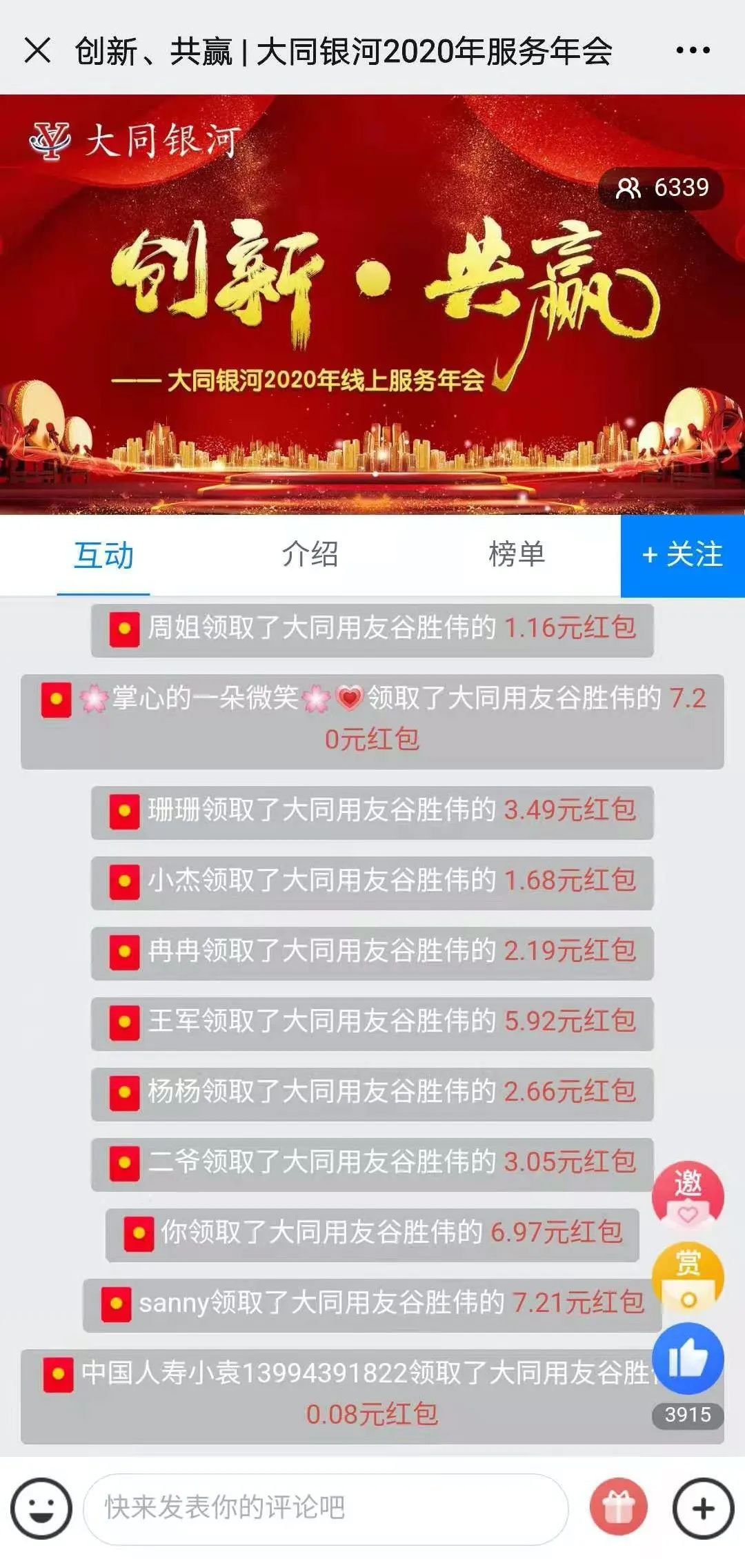 2020年12月22日下午3點,大同銀河舉辦了“2020年線上服務(wù)年會”。年會主要內(nèi)容由用友高級咨詢顧問彭澤華和用友數(shù)字化咨詢總監(jiān)費燕分別就《數(shù)智企業(yè) 財稅引領(lǐng)》和《U8C集團(tuán)管控介紹》做了精彩的專業(yè)講解。直播現(xiàn)場在線人數(shù)最高達(dá)6383人,3915人次進(jìn)行直播點贊,評論區(qū)互動不斷、紅包雨不停,場面空前活躍。